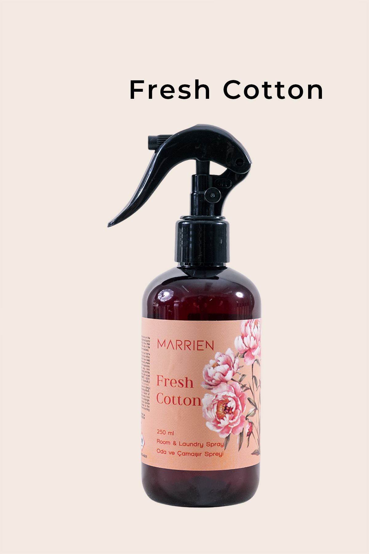 Fresh Cotton, sadece bir oda spreyi değil, aynı zamanda stil sahibi bir dekorasyon objesidir. İlhamını gün batımının sıcak tonlarından alan amber rengi şişesi, ortamın enerjisini yükseltirken, üzerindeki zarif gold MARRIEN baskısı sofistike bir dokunuş katar. Bu şık tasarımlı oda spreyi, her dekora uyum sağlayan minimalist estetiğiyle bulunduğu alana zarafet getirir.