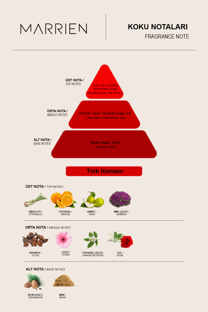 Turkish bath, saten kırmızı cam şişesiyle ilk bakışta göz alıcı bir duruş sergiler. Gümüş renkli kapağı ve gümüş marrıen baskısıyla bu Dekoratif oda kokusu,